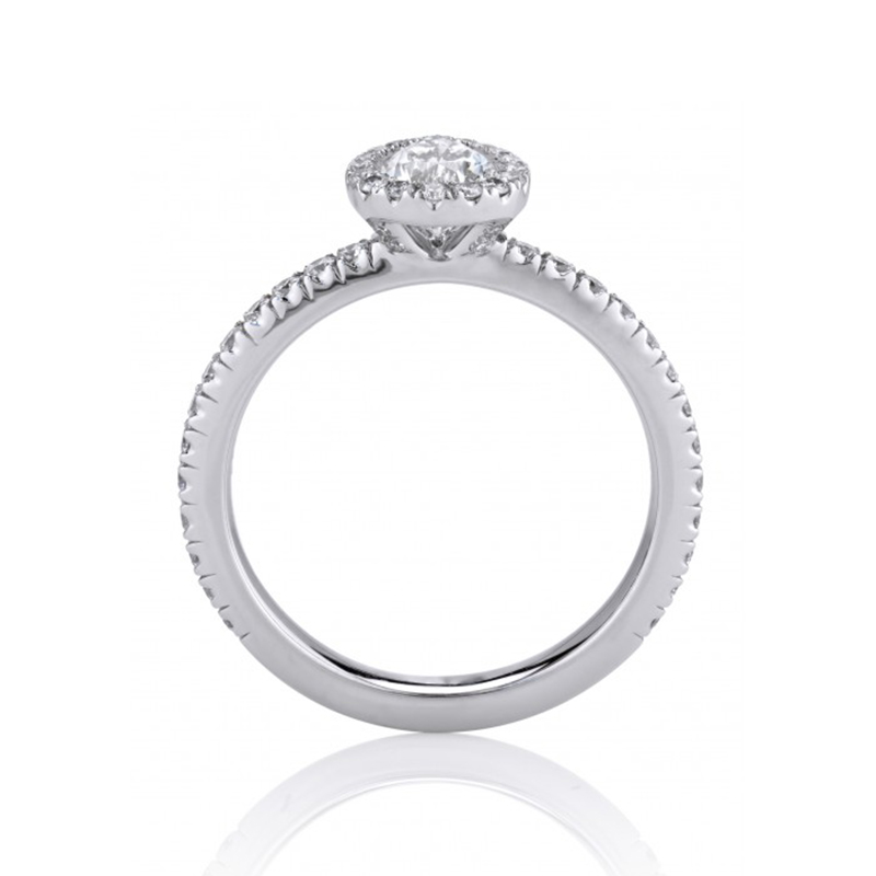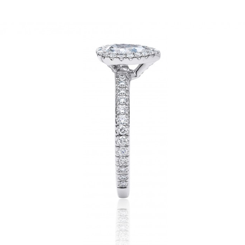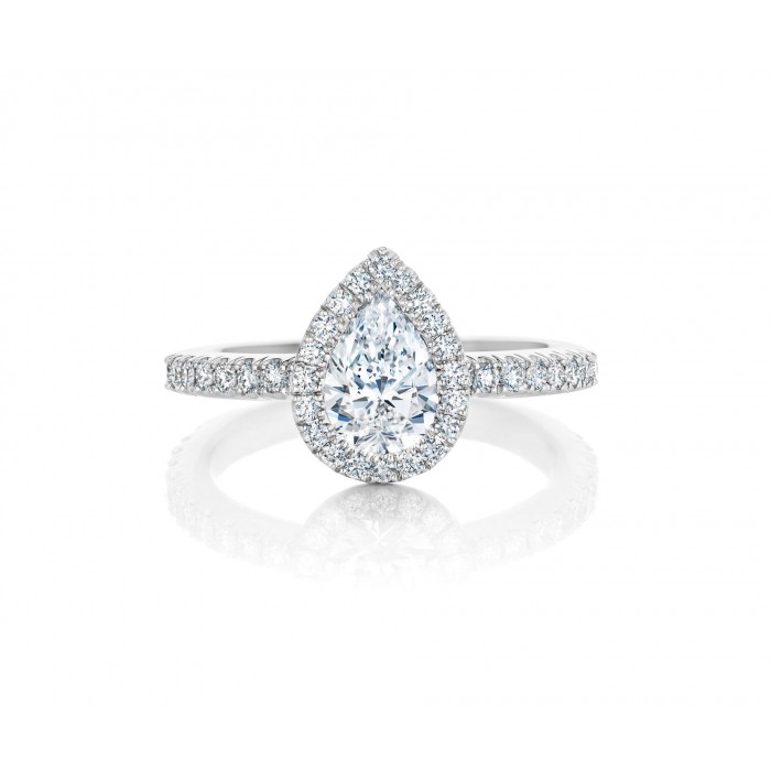 18k白金 耀眼夺目的梨形主钻由珠链式边镶钻石璀璨簇拥,营造出迷人的光晕效果。结合圆形明亮式切割与榄尖形切割,这种独特的泪滴形钻石。