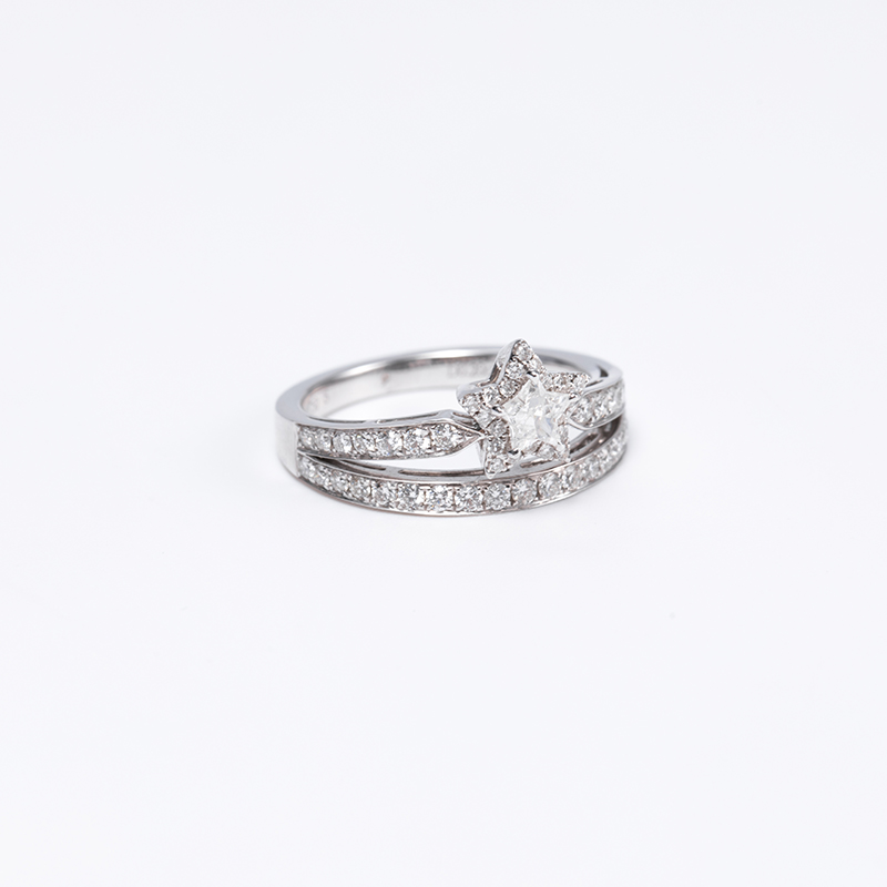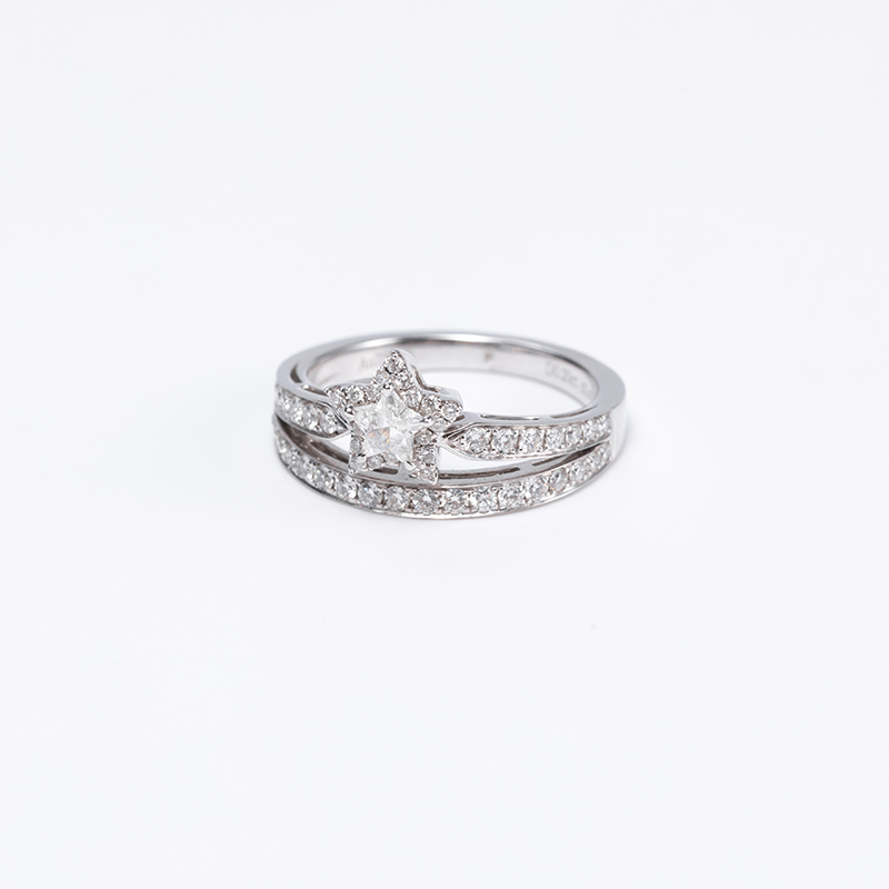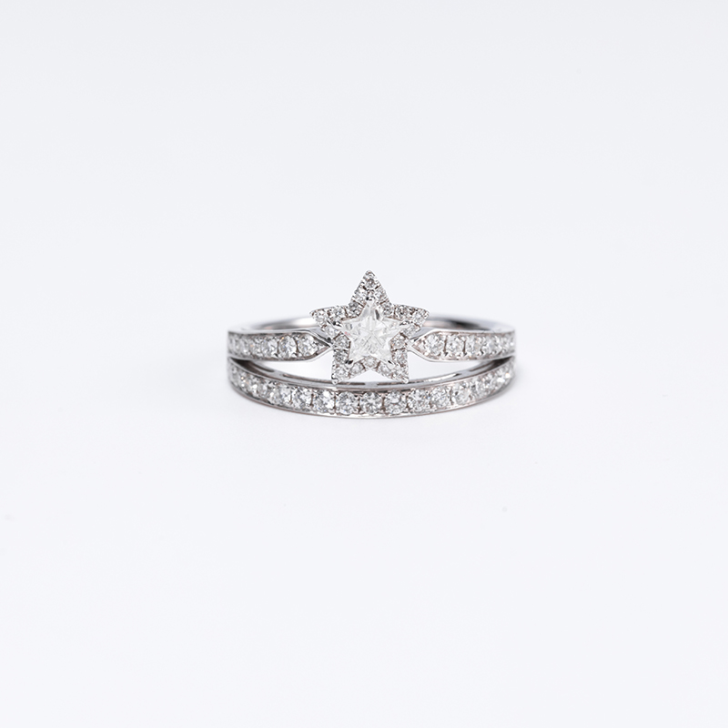 此款以星形切割形状的钻石戒指,为装扮注入更加闪耀迷人的神秘感 54颗辅钻呼应包围主钻周边,仿若繁星点缀指间